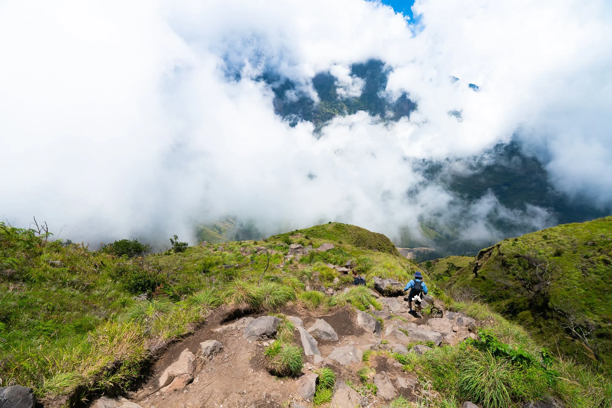 Once you round the the lip and look towards the route back down below the clouds and into the jungle.