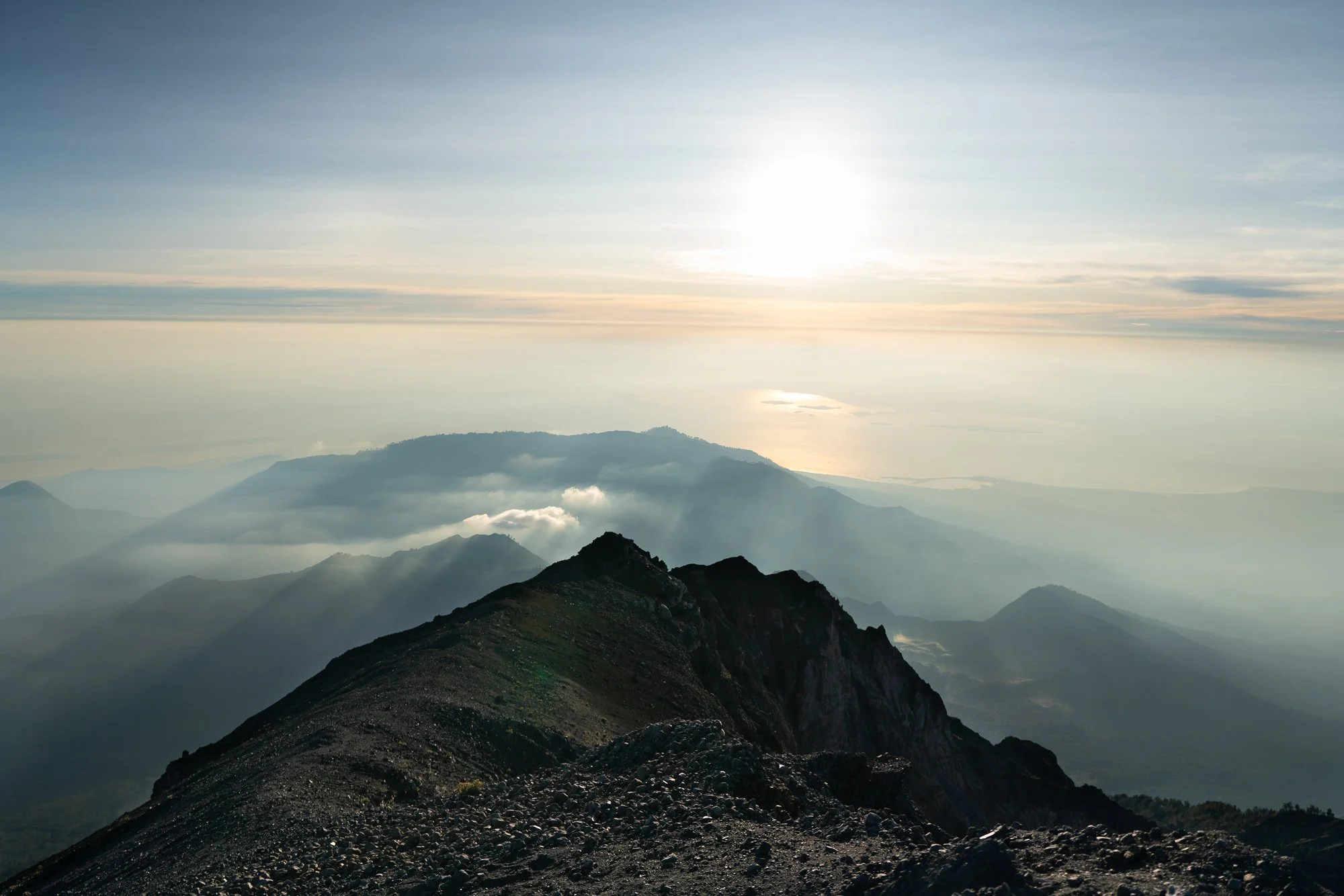Despite what one might imagine while being in the humid equator, while on the summit, the wind chill was biting at any exposed skin, indeed even rendering what layers we wore inadequate. There were even some who donning their sleeping bags so they may sit and enjoy the view of the rising sun over the laden atmosphere. scanning the horizon, one could see surrounding islands that dotted the horizon.
